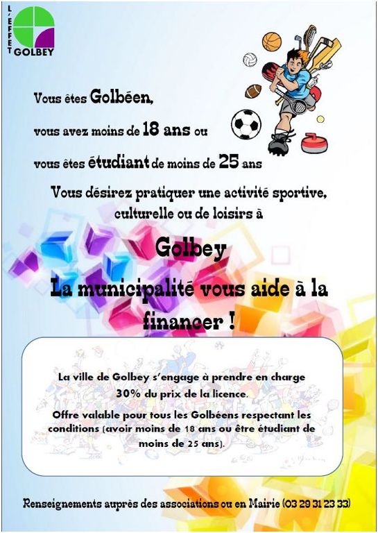 Vous êtes Golbéen, avez moins de 18 ans ou êtes étudiant de moins de 25 ans, la municipalité aide à financer votre activité sportive dans notre club.