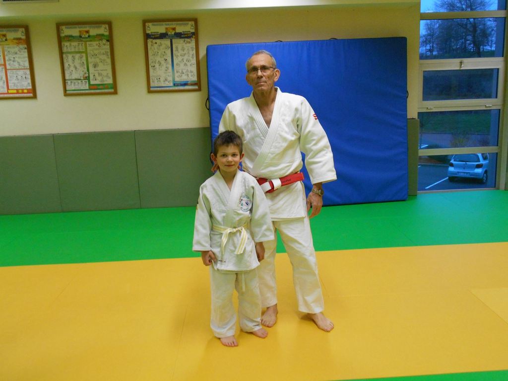 A la fin du cours, Bernard lui a remis une nouvelle ceinture, blanche avec 2 liserets jaunes.