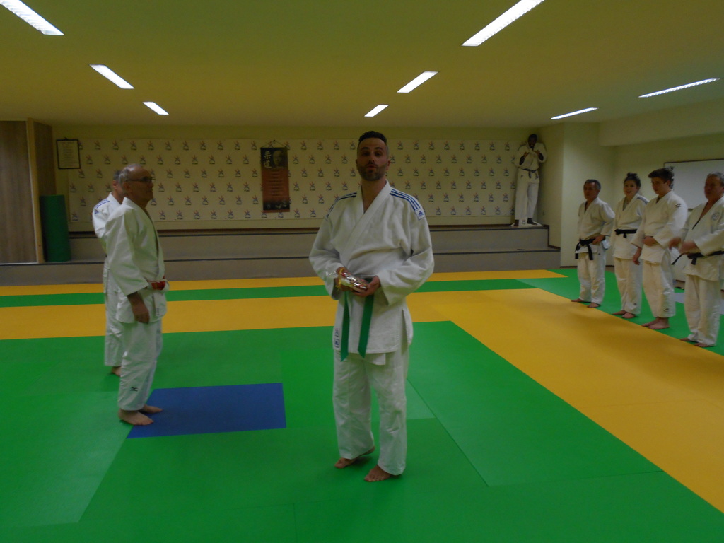 Lors du cours du mercredi 16 décembre, Nicolas, alors ceinture blanche, s'est vu remettre la ceinture verte par Bernard.