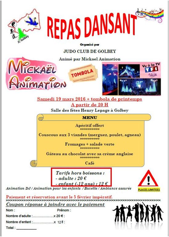 Animations pour les enfants, tombola avec de nombreux lots à gagner, apéritif, repas traiteur Bertrand et Combes à Golbey, danses jusqu'au petit matin avec Mickaël Animation,
