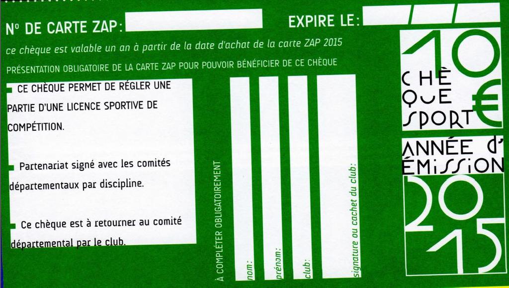 Celui-ci se trouve dans le chéquier remis avec la carte ZAP, il est de couleur vert. Comme l’année dernière, les 10€ sont déductibles sur le prix de la licence fédérale.