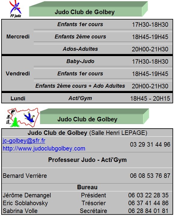 - judo enfants 2ème cours + ado-adultes: 20h00 - 21h30 (des ateliers seront organisés en fonction des différents cours)