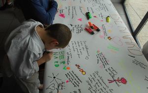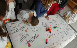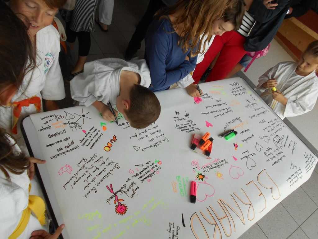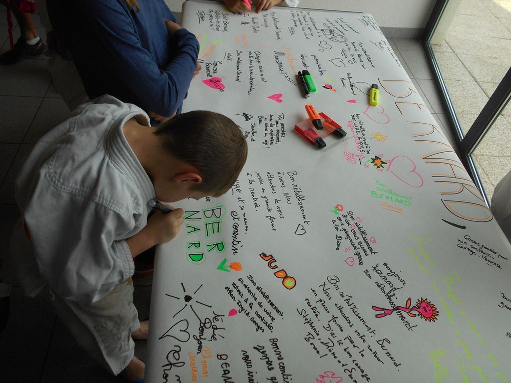 Un absent de marque en ce jour très particulier, notre professeur et ami Bernard qui n'a pu se joindre à nous pour des raisons de santé. Une grande affiche a été réalisée en son honneur par la plupart d'entre nous.