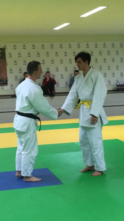 A la fin du cours de vendredi, Aymerick est appelé sur le tatami. Il pense avoir effectué un bon entrainement et s'attend à être félicité par un salut. Une autre surprise l'attend ! Solennellement, Jonathan lui remet sa ceinture jaune. Bravo Aymerick !